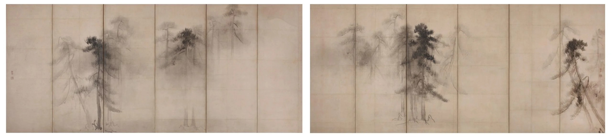 「ぼくはあと何回、満月を見るだろう」という本で坂本さんは芸術におけるロゴスの不信を説いておられ、そして、この「松林図屏風」の話になった、と記憶しております。ロゴスを調べると言葉、意味、論理ということ。ロゴスの反対はパトスで、情熱、感情、哀愁、苦悩、同情ということ。「松林図屏風」はロゴスでもパトスでもなく、直感でしか得られない何かであるような気がして、それは顕現といっていいことであろう、とも思います。それは能舞台の鏡松であるかもしれないし、十牛図の「返本還源」であるかもしれません。「松林図屏風」の前でたたずむことはとてもいいことなのです。