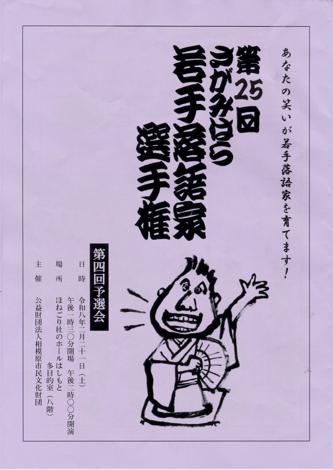 第25回さがみはら若手落語家選手権の第4回予選会でございます。見た演目を記します。前座の桂あま夏くんの「つる」、二ツ目の立川成幸くんの「宮戸川」、二ツ目の三遊亭ごはんつぶくんの「かながわの謎」、二ツ目の三遊亭遊かりさんの「夢の酒」で仲入りとなりました。二ツ目の立川談洲くんの「あくび指南」、二ツ目の三遊亭好青年の「千早振る」でした。