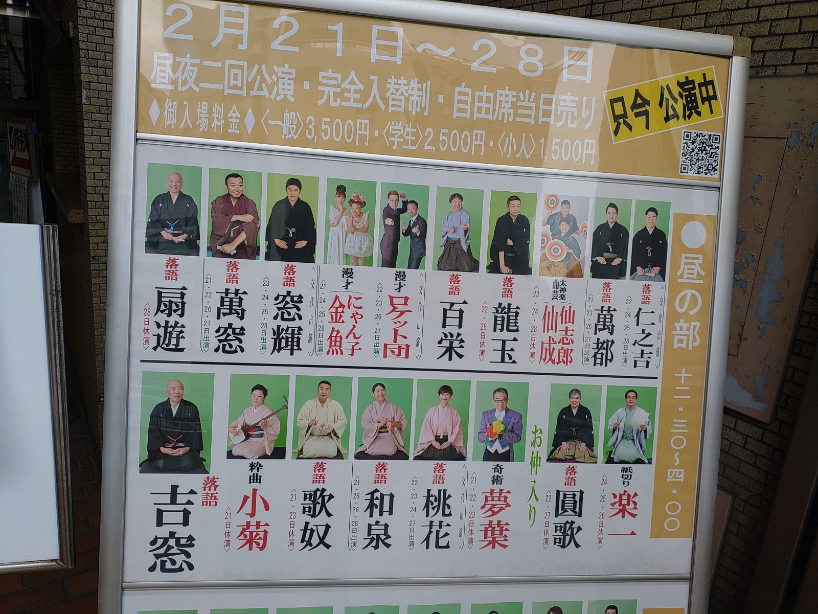 二月二十四日、上野の鈴本演芸場にて令和八年二月下席昼の部です。見た演目を記します。前座の桃月庵ぼんぼりくんの「寿限無」、二ツ目の三遊亭仁之吉くんの「猫と金魚」、ストレート松浦さんのジャグリング、蜃気楼龍玉師匠の「道灌」、春風亭百栄さんの漫談、すず風にゃん子さんとすず風金魚さんのお二人の漫才、三遊亭窓輝師匠の「釜泥」、入船亭扇遊師匠の「浮世床」、林家八楽師匠の紙切り、三遊亭圓歌師匠の「夜間工事中」でお仲入りとなりました。伊藤夢葉さんの奇術 、蝶花楼桃花師匠の「権助提灯」、三遊亭歌奴師匠の「初天神」、柳家小菊師匠の三味線弾きの、唄いの粋曲、主任は三遊亭吉窓師匠の「鹿政談」でした。