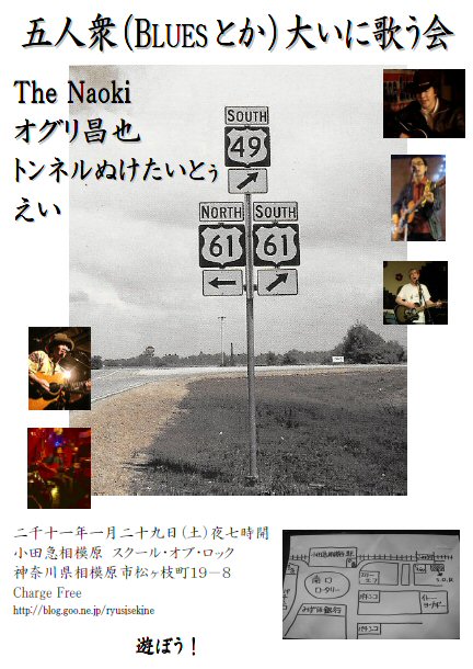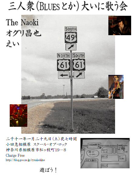 来る2011年1月29日(土)に小田急相模原駅近くのバー、スクールオブロックでライブをするのですが、フライヤーを作ってみました。今回のライブはブルース色濃くなる予感もします。来てね。