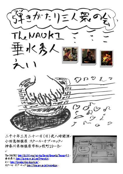 またフライヤーを作ってしまいました。2010年3月21日(日)の連休の真ん中に小田急相模原のbar SCHOOL OF ROCKで弾きがたって歌うのら。垂水秀人くんはぼくが誘って、東京の池袋の向こうのブルーズ・アレアである江古田からかけつけてくれて、いい歌、いっぱい歌ってくれるよん。出させてくれまするbar SCHOOL OF ROCKの龍司さん、ありがとちゃん。みんな、飲みに来てねん。