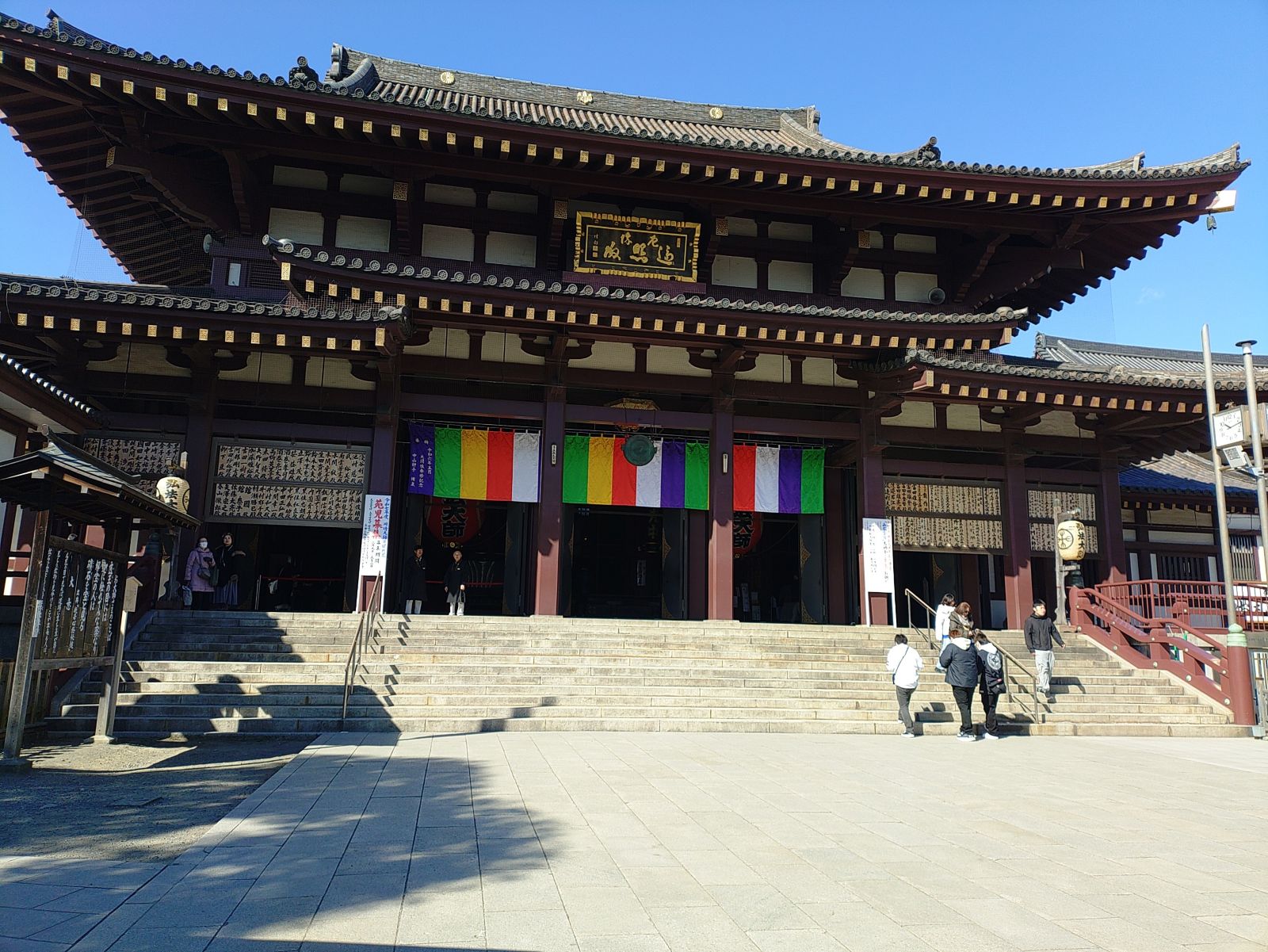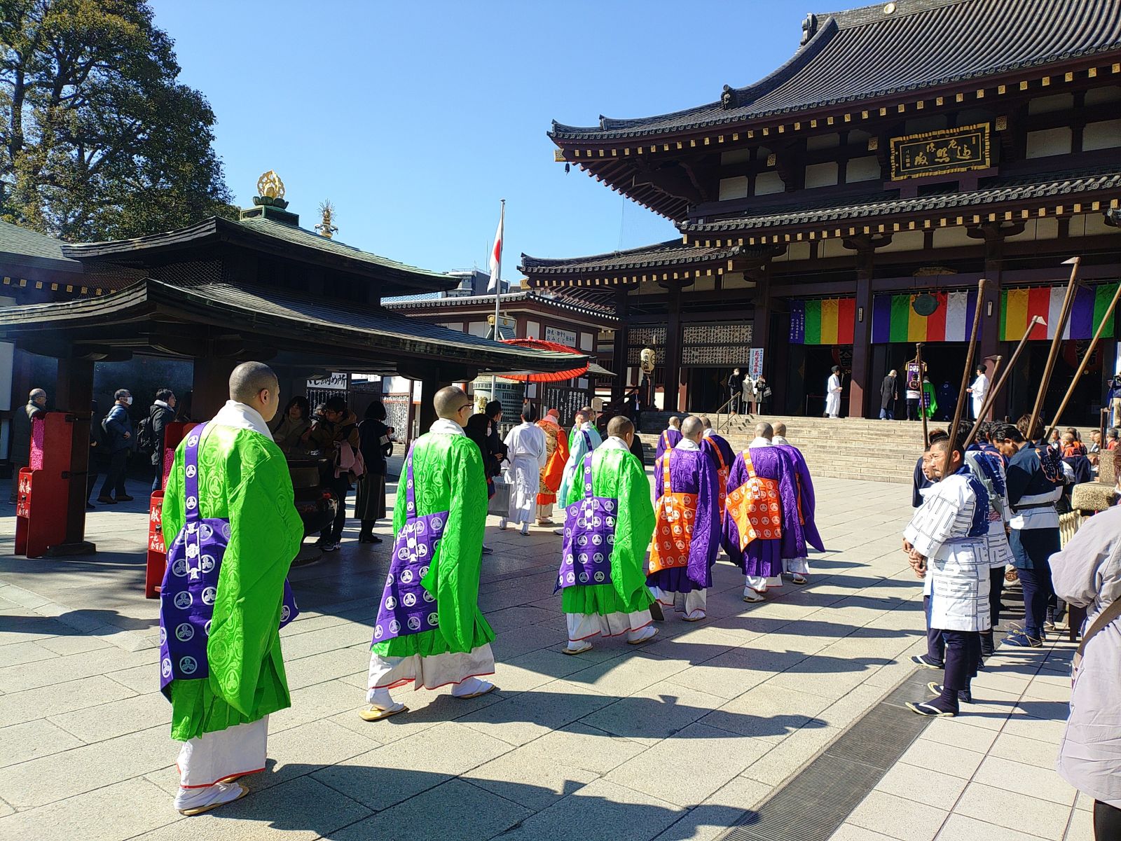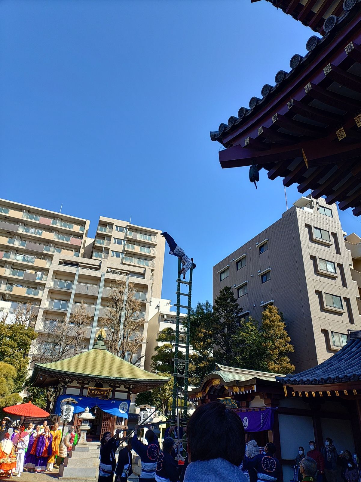 祈願の後、自動車交通安全祈祷殿から少し離れている大山門から歩き、大本殿でのお参りをいたしました。川崎大師では、聖徳太子年祭が執り行われていて、川崎鳶工業連合会、川崎古式消防記念会会員の方々を中心とする川崎大師聖徳太子講の方々が参列し、法要後、若鳶会会員により「はしご乗り」が披露されておりました。