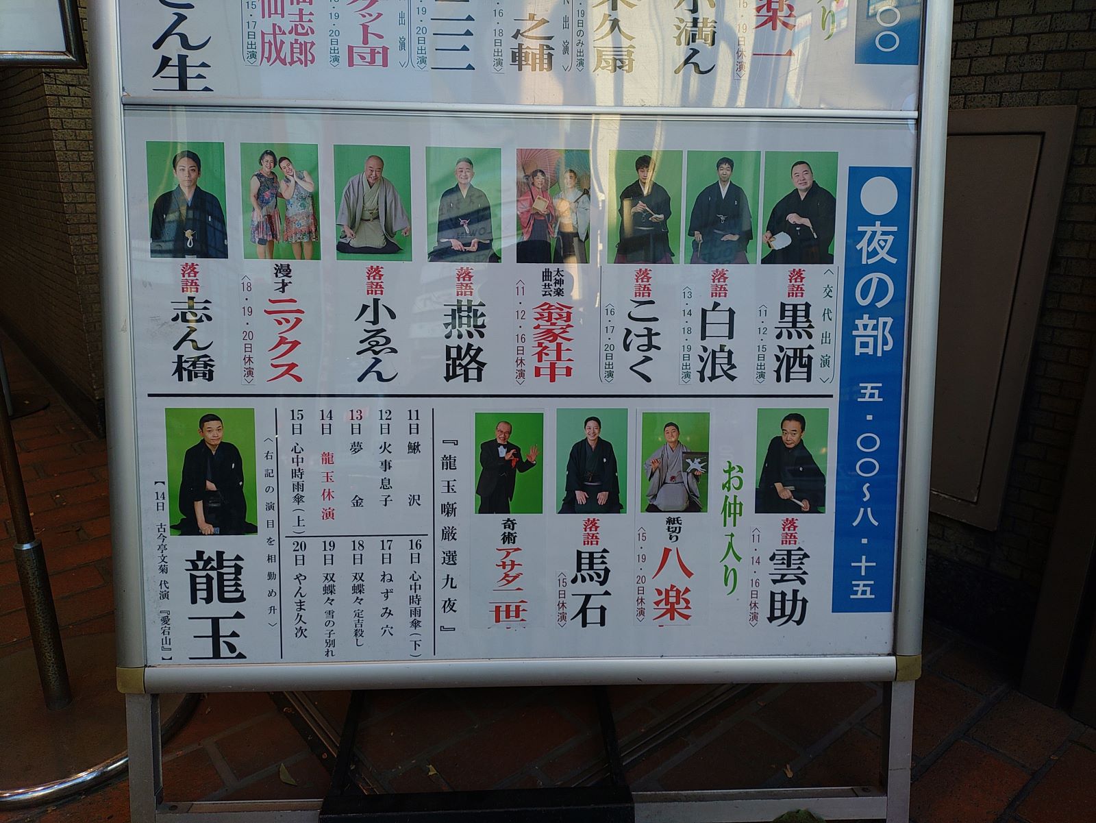 二月十三日の上野鈴廣演芸場令和七年二月中席夜の部を見ました。例のごとく、見た演目を書き出してみます。前座の三遊亭二之吉くんの「松竹梅」、二つ目の桃月庵白浪くんの「庭蟹」、翁家社中のお二人の太神楽曲芸、柳亭燕路師匠の「垂乳根」、柳家小ゑん師匠の「レプリカント」、ニックスのお二人の漫才、古今亭志ん橋師匠の「粗忽の釘」、五街道雲助師匠の「身投げ屋」で仲入りです。林家八楽師匠の紙切り、隅田川馬石師匠の「鮑のし」、アサダ二世さんの奇術、主任は蜃気楼龍玉師匠の「夢金」でした。