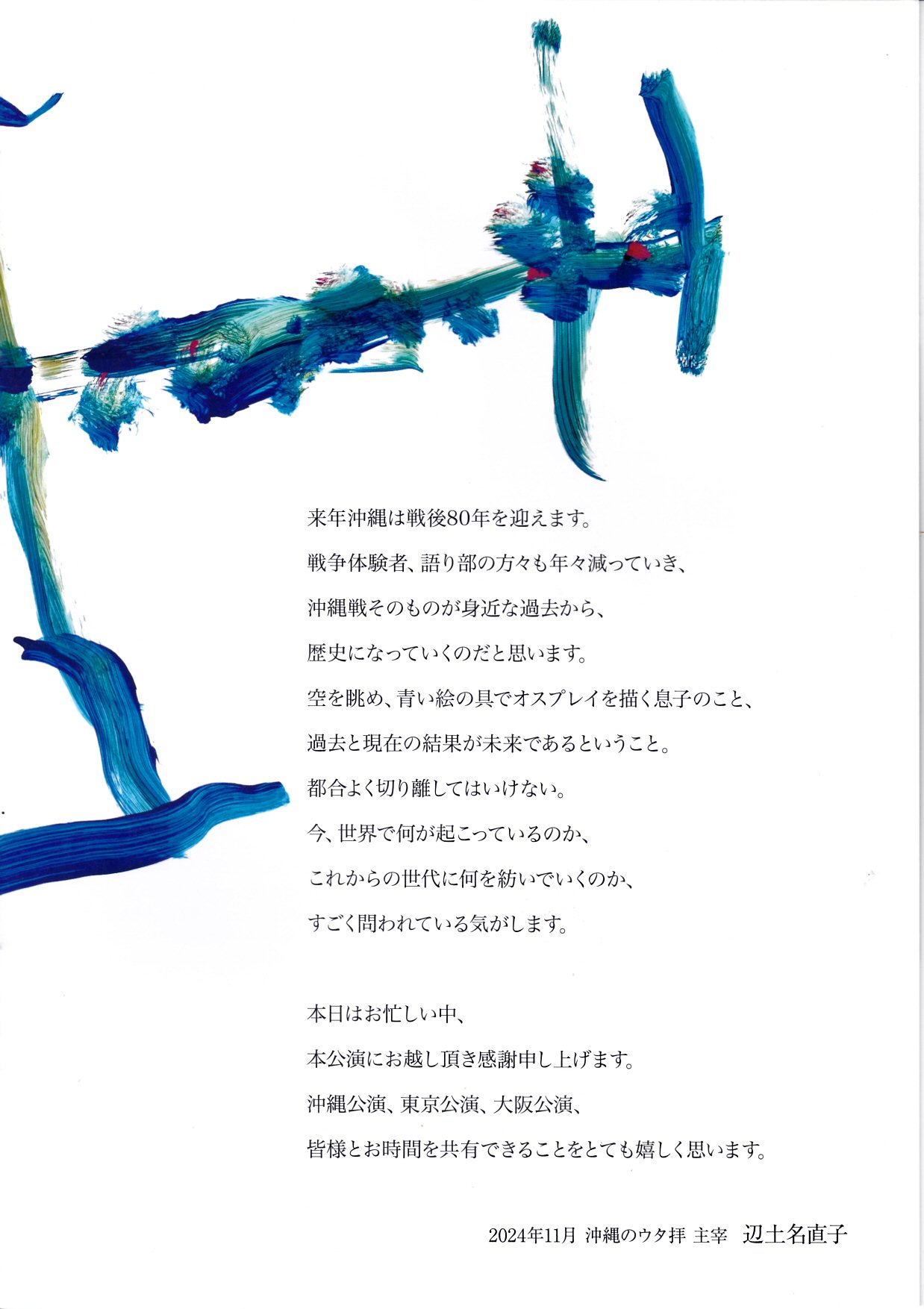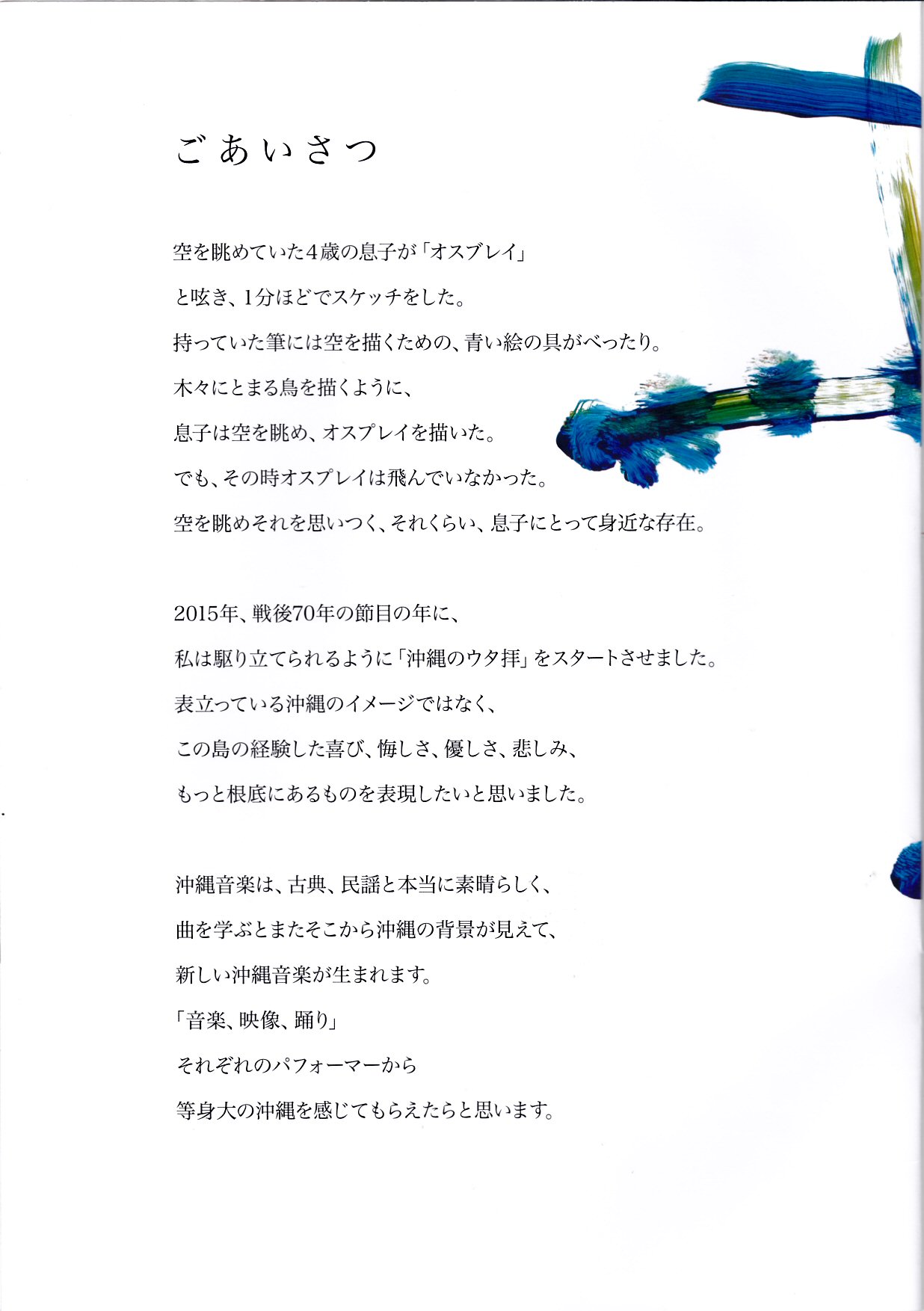 一部と二部の約一時間づつの二部構成の、この「沖縄のウタ拝」は前半は「静」、後半は「動」といった按配で、沖縄の過去と現在の心が伝わってきて、沖縄からの未来へのメッセージが指し示され、ぼくはそのメッセージを確かに受け取ったように思われますぞ。
