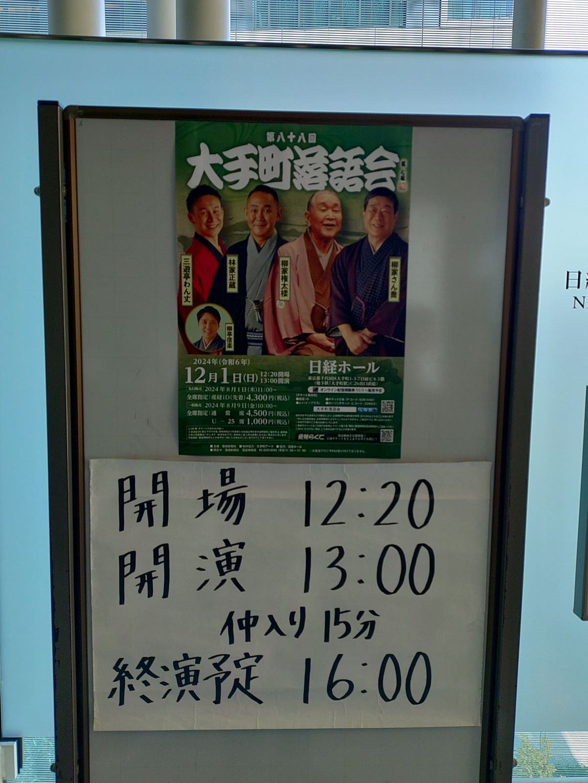 大手町の日経ホールで「第八十八回大手町落語会」を見ました。見た演目を記します。前座の柳亭市助くんの「まんじゅう怖い」、二つ目の柳亭信楽くんの「俺の夢」、三遊亭わん丈師匠の「壺算」、柳家権太楼師匠の「言い訳座頭」で仲入りとなりました。林家正蔵師匠の「蛸坊主」、主任は柳家さん喬師匠で「芝浜」。