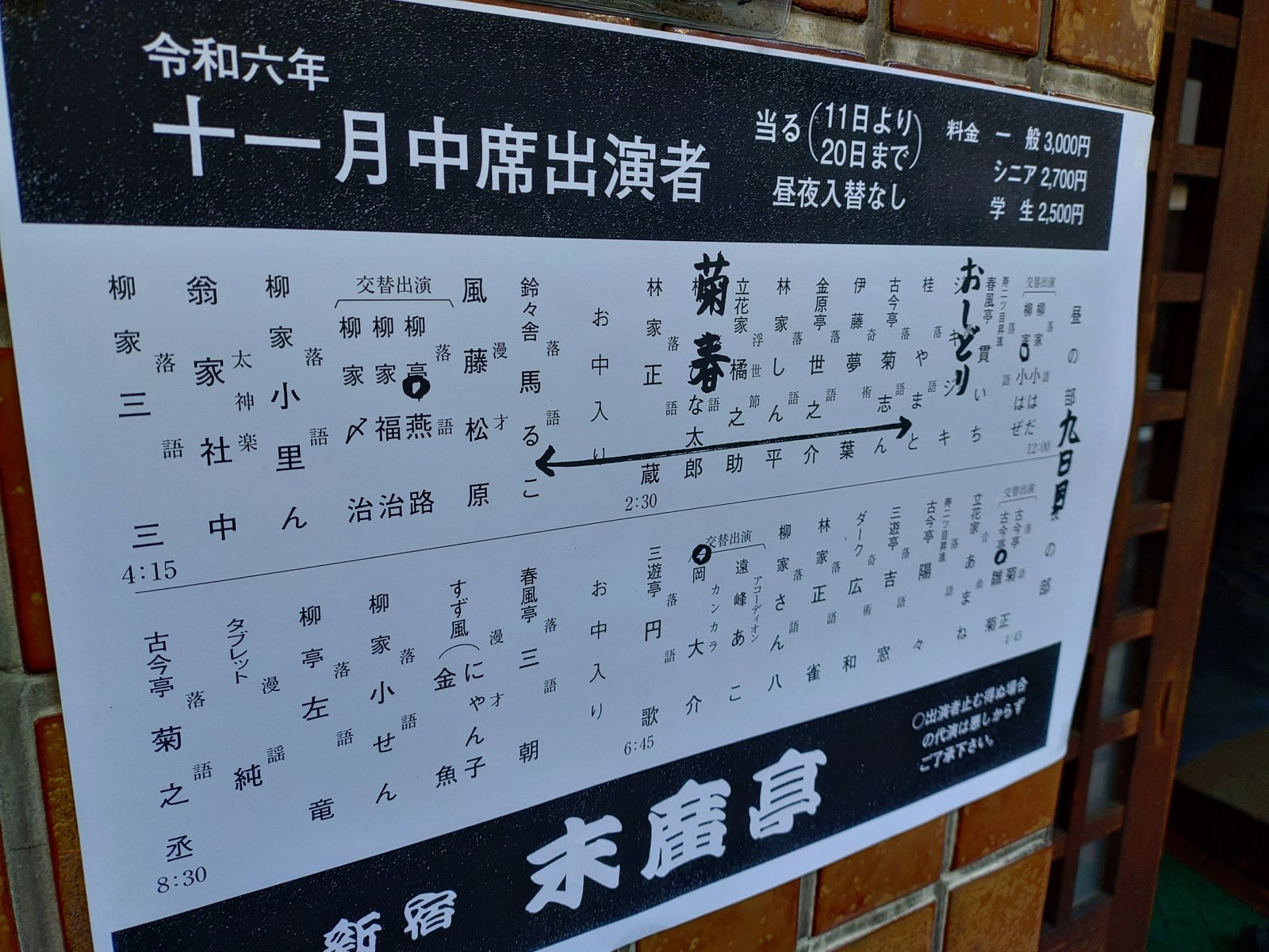 新宿末廣亭で令和六年十一月中席昼の部です。見た演目を書き出してみます。前座の柳家小じかくんの「寿限無」、二つ目の柳家小はぜくんの「饅頭怖い」、二つ目の春風亭貫いちくんの「スパイダーマン」、おしどりのお二人の漫才、鈴々舎馬るこ師匠の「東北の宿」、古今亭菊志ん師匠の「短命」、伊藤夢葉さんの手品、金原亭世之介「宮戸川」、林家しん平師匠の漫談、立花家橘之助師匠の三味線弾きの唄いの浮世節、古今亭菊春師匠の「蛙茶番」、林家正蔵師匠の「ぞろぞろ」で仲入りとなりました。桂やまと師匠の「近日息子」、風藤松原のお二人の漫才、柳亭燕路師匠の「鹿政談」、柳家小里ん師匠の「真田小僧」、翁家社中のお二人の大神楽、主任は柳家三三師匠で「締め込み」でした。