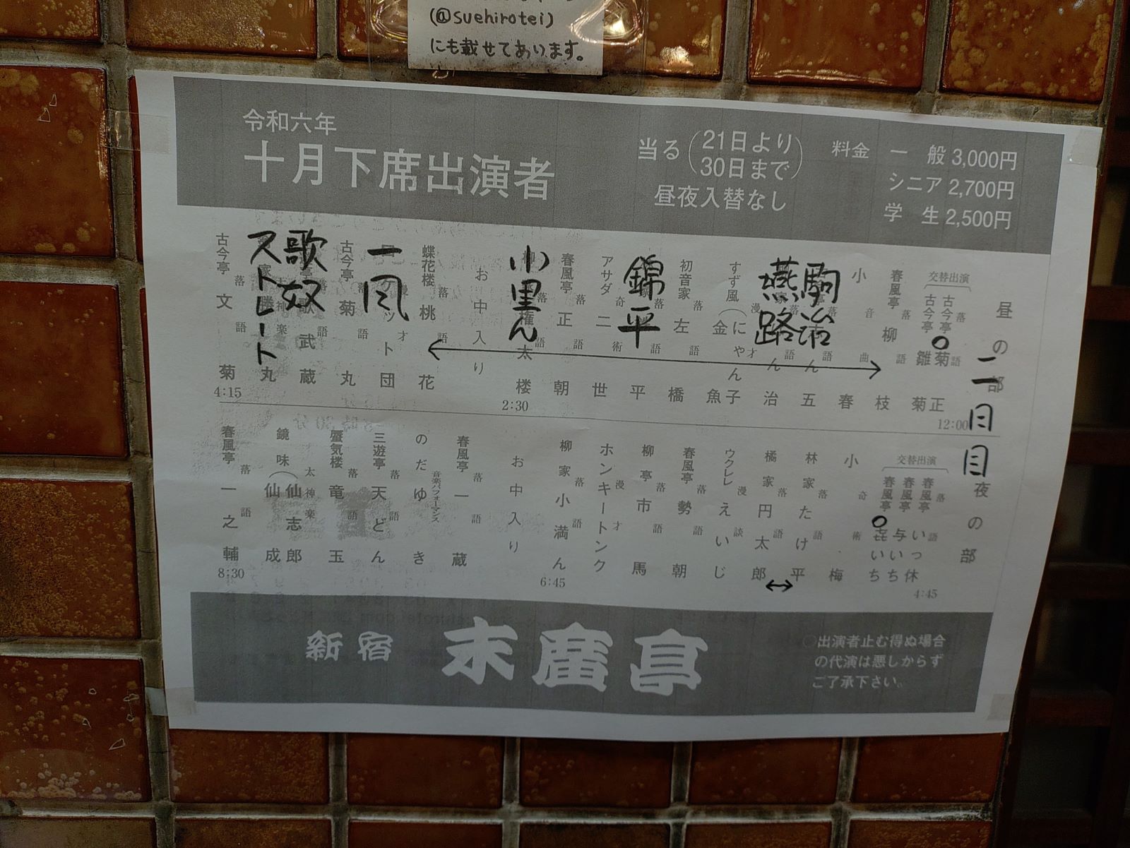 新宿末廣亭に今日は昼から夜までの9時間近くいたしまった。令和六年十月下席です。昼の部と夜の部のそれぞれの見た演目を書き出してみます。