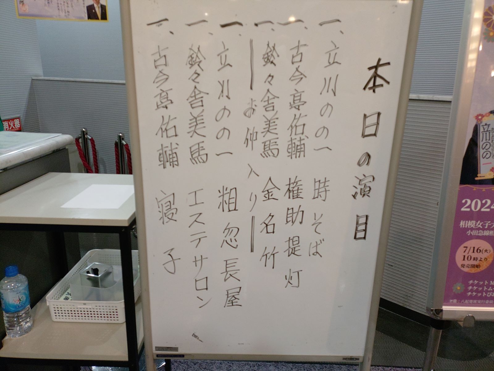 見た落語を書き出してみます。立川のの一さんの「時そば」、古今亭佑輔さんの「権助提灯」、鈴々舎美馬さんの「金明竹」で仲入りとなりました。そして、立川のの一さんの「粗忽長屋」、鈴々舎美馬さんの「エステサロン」、主任は古今亭佑輔さんの「寝子」。