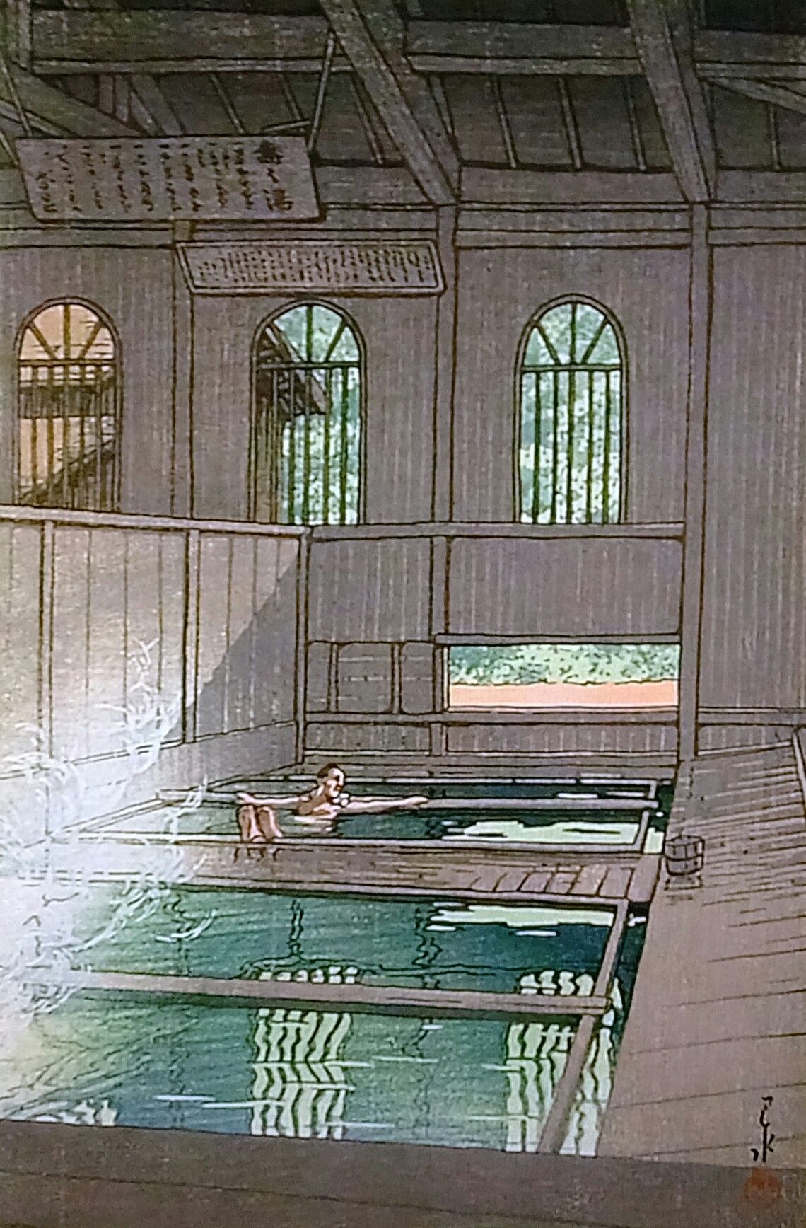 法師温泉は水上温泉をさらに北に車を走らせ、群馬県と新潟県の県境の山の中、森の中にあって、長寿館は一軒家で明治時代の建てものが歴史のかなたから忽然と姿を現す。川瀬巴水の版画は長寿館の三つある湯船のひとつの法師の湯でところどころで黒いごろた石がしかれているところでぷくぷくと湯もわいていて、それがかすかに硫黄の香りただよう無色透明のこのうえない上質。しかも苔むした屋根の明治からの建てものが風情と情趣をさそう。あまりの素晴らしさに、ぼくは何度も湯船に足をはこんでしまいました。読んだ句。
