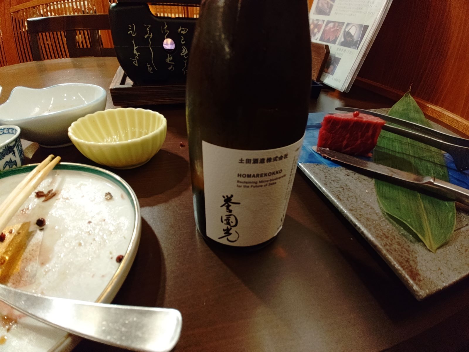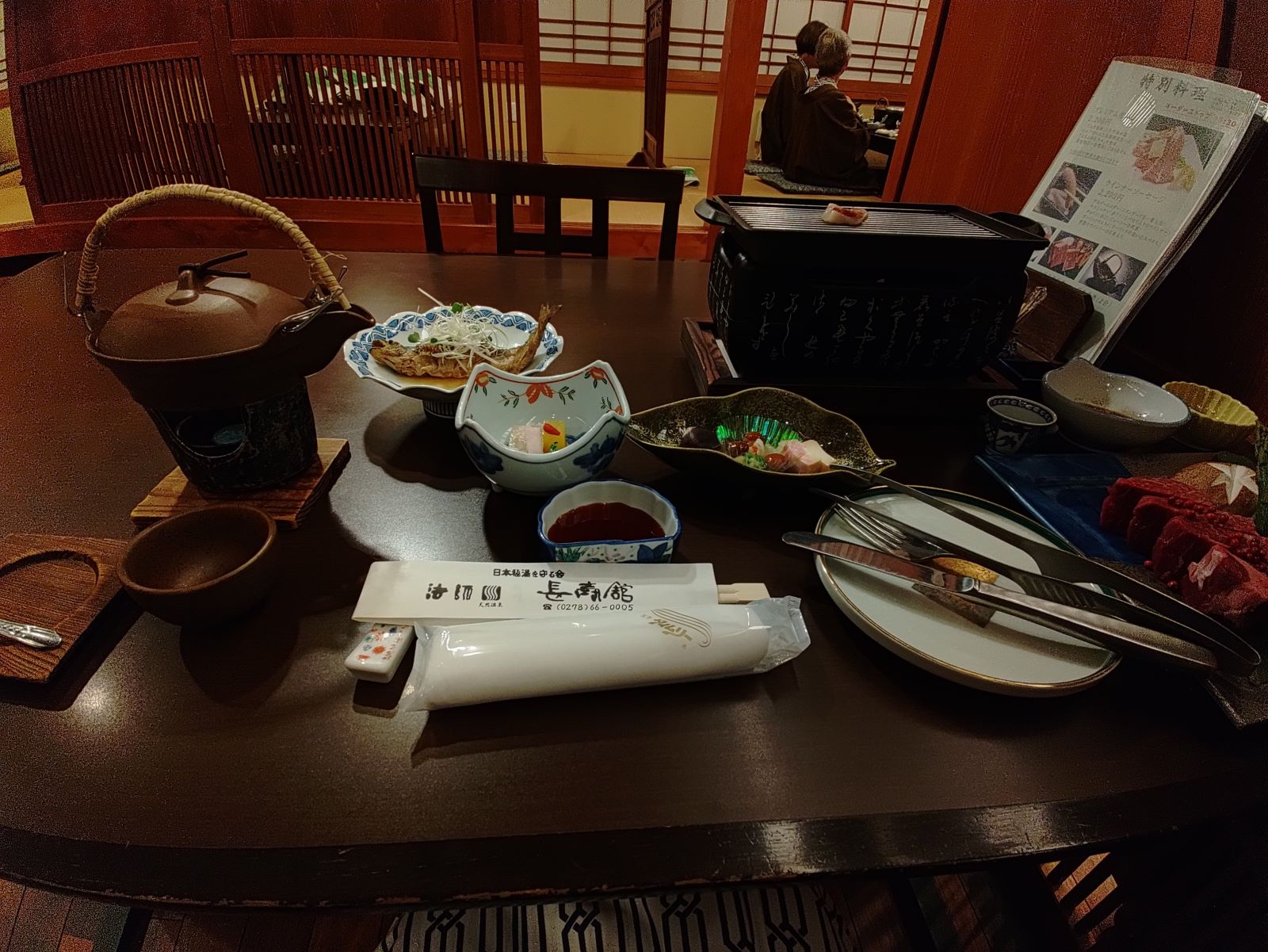 夕食は上州牛のステーキ、松茸の土瓶蒸し、鯉のあらいの刺身、岩魚の南蛮漬けなど、ぼくのあまり食べたことのないものも出て、どれもとても美味しい。地酒の「誉国光(ほまれくにみつ)」のきりっとした美味しさよ。