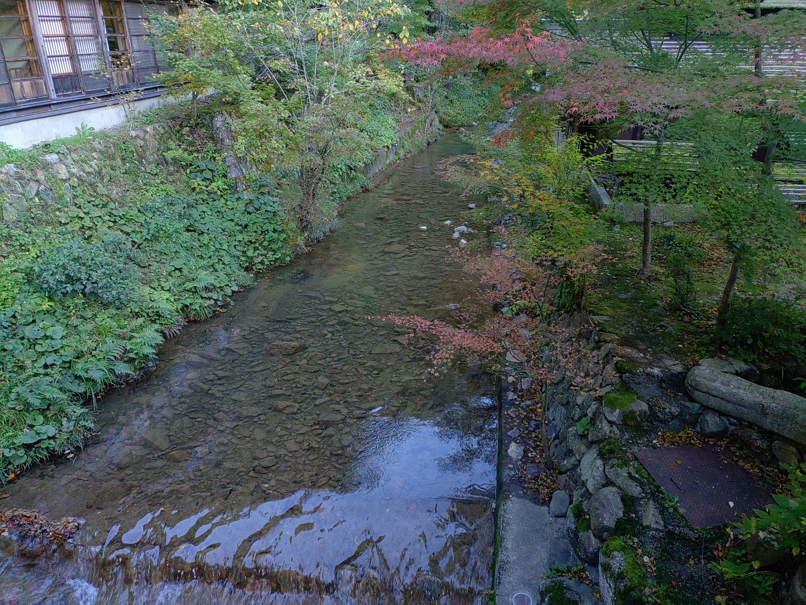 翌朝、館内を散歩していると流れている川に岩魚がおよいでいるのを見て驚く。毛鉤を投げて一匹ぐらい釣って、放ちたいものだ。けれども、釣り竿は持ってきてはいなく、今は禁漁期間です。読んだ句。
