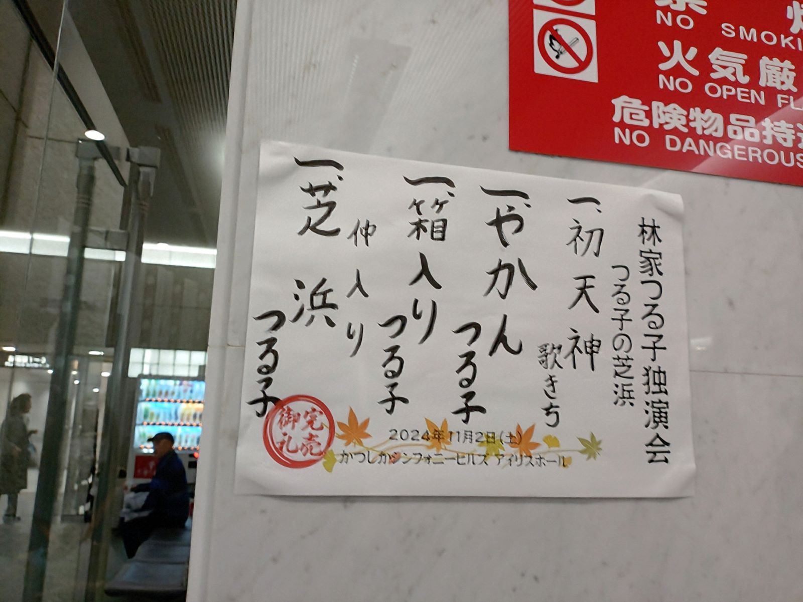 かつしかシンフォニーヒルズのアイリスホールで『林家つる子独演会 つる子の芝浜』を見ました。見た演目を書き出してみます。前座の三遊亭歌きち師匠の「初天神」、 林家つる子師匠の「やかん」と「箱入り」で仲入りとなりました。仲入りをあけて、林家つる子師匠の(つる子版)「芝浜」となります。