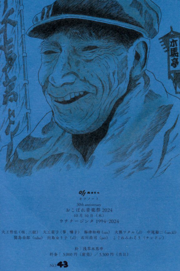 浅草の木馬亭で『ウチナージンタ1994-2024』と称されたインディーレーベル「off note」30周年記念のコンサートを見ました。出演したミュージシャンを失礼にも敬称略でご紹介します。大工哲弘(唄, 三絃)・大工苗子(箏, 囃子)・梅津和時(saxophone, clarinet)・大熊ワタル(clarinet, accordion)・中尾勘二(saxophone, klarinette)・関島岳郎(tuba)・向島ゆり子(violin)・石川浩司(percussion)。素晴らしい歌と演奏でした。客先は何か、ぼくの同世代の同胞たち、同志たちの同窓会のような空気にあふれておりました。みんな、よく生きのびてきたよ。ミュージシャンたちにレスペクト。「off note」の主催者の神谷一義さんにもレスペクト。ぼくらの第二章の始まりだ。