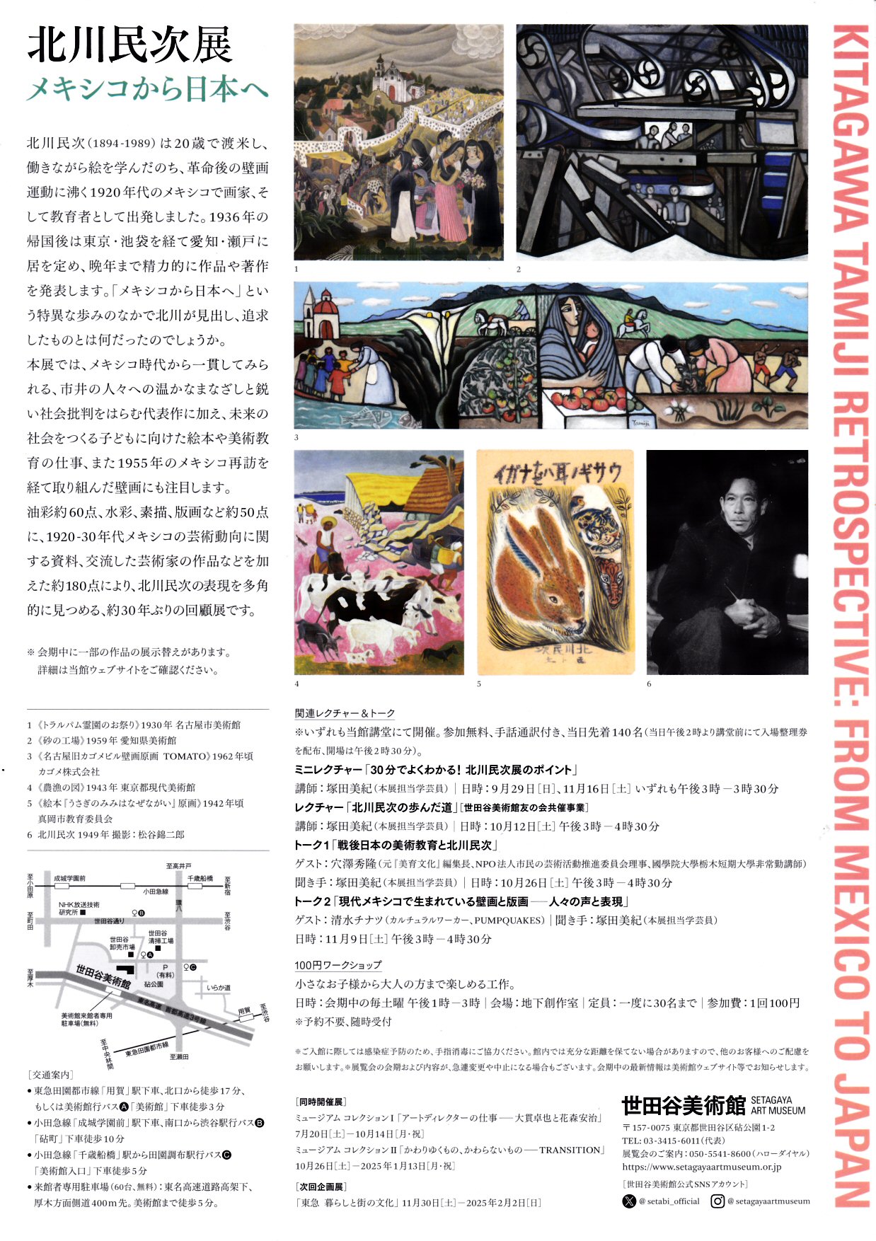世田谷美術館の『北川民次展 メキシコから日本へ』を見ました。北川民次は第二次世界大戦前にメキシコに渡った絵描きで、そのメキシコでは、フリーダ・カーロの夫、ディエゴ・リベラを中心とした民主主義、民衆主義の壁画運動の盛んであったころ、自由の空気を満々と吸い、民族と民俗の混交した生き生きとした世界を表現していたのだが、戦中の日本に戻り、その窒息するばかりの軍国主義に暗喩を織り込んでの気づかれないような抵抗の絵となる。メキシコでの民衆主義のようなものは北川民次を生涯にわたって突き動かすのだが、日本社会の壁にぶつかり、常に暗中模索に混迷しているかのようでもあるのです。そのような葛藤の鈍色の絵も美しく、メキシコ時代の伸びやかさはないけれど、そのような北川民次の絵を描くことによる戦いにぼくは共感してしまう。