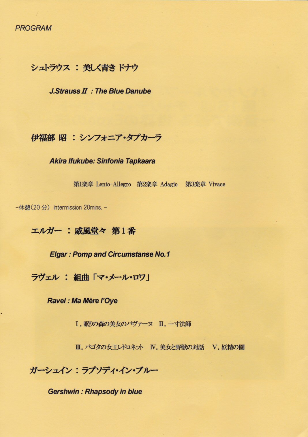「音楽で巡る世界のExpo」というテーマで選曲され、一曲目に演奏された曲はシュトラウスの『美しき青きドナウ』で、その美しい音楽の響きにぼくは眠くなってしまう。2曲目が「ゴジラ」のテーマ曲を作った伊福部昭の『シンフォニア・タプカーラ』。「タプカーラ」とはアイヌ語で「立って踊る」という意味で、その土俗とすら感じさせる現代音楽のような異様な旋律も含み、めったに聴くことのできないこの曲に胸の高鳴る面白さを感じました。20分の休憩をはさんでエルガーのおなじみの『威風堂々』の第一楽章。次にラヴェルの組曲『マ・メール・ロワ』で、その中の「パゴダの女王レドロネット」が細野晴臣さんの作る中華風ポップスメロディーを思い出させ、面白かった。ラストはいつかオーケストラのライブで聴いてみたいと思っていたガーシュインのピアノ協奏曲『ラプソディ・イン・ブルー』を小原孝さんのピアノが加わり、堪能しました。