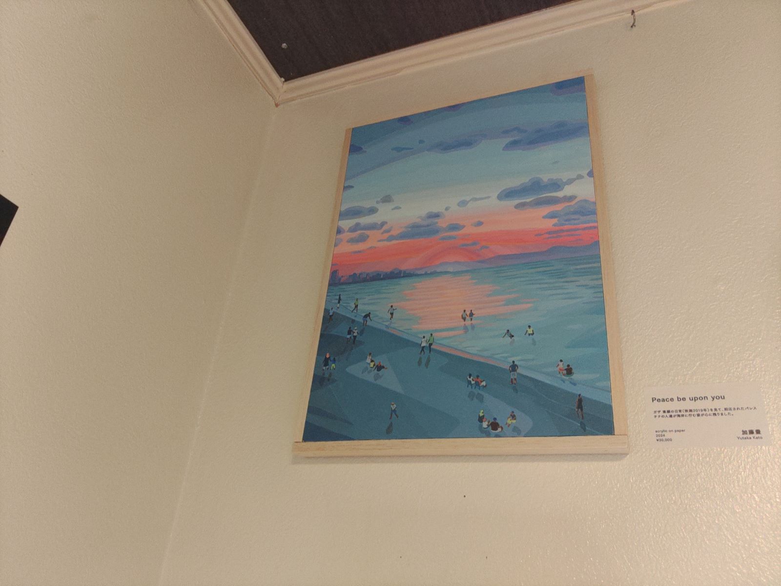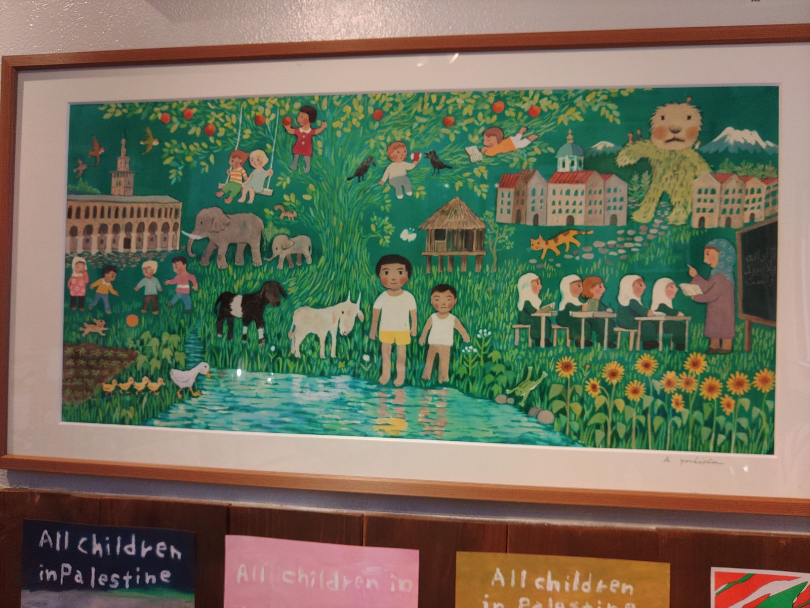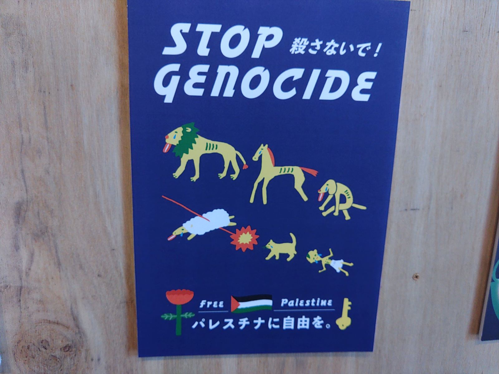 登戸駅近くのNAMNAM Spaceというところで開催されている『パレスチナ あたたかい家』と題された展覧会に行ってみました。一部屋のスペースに新進の作家のパレスチナ支援のためのいろんな絵や作品が並んでいます。このような展覧会を見に来るのは、ぼくのような、かわりもの、はぐれものの老人ばかりで、閑散としていると思いきや、それなりの人の入りで、ぼく以外は若い人ばかりであるのを、ぼくは希望と感じたのです。きっと、みんなの思いは一つ、虐殺がやむことを願うばかり。