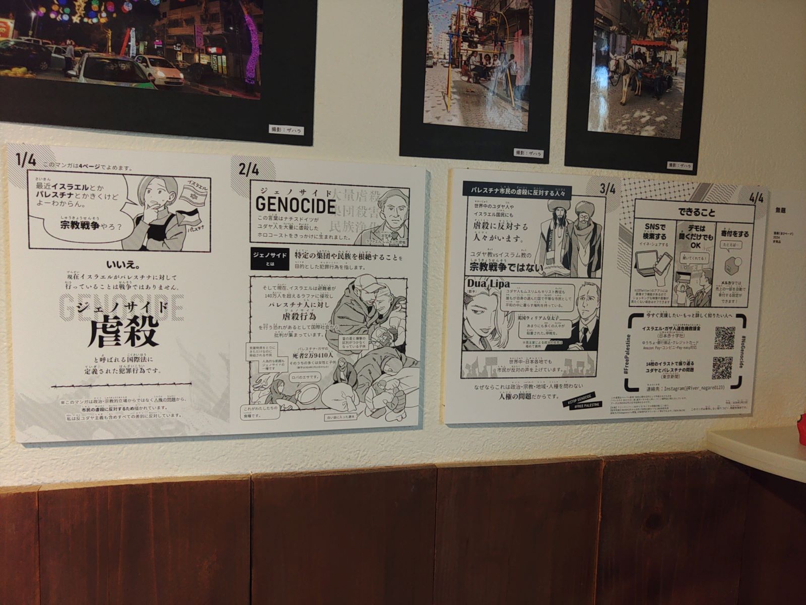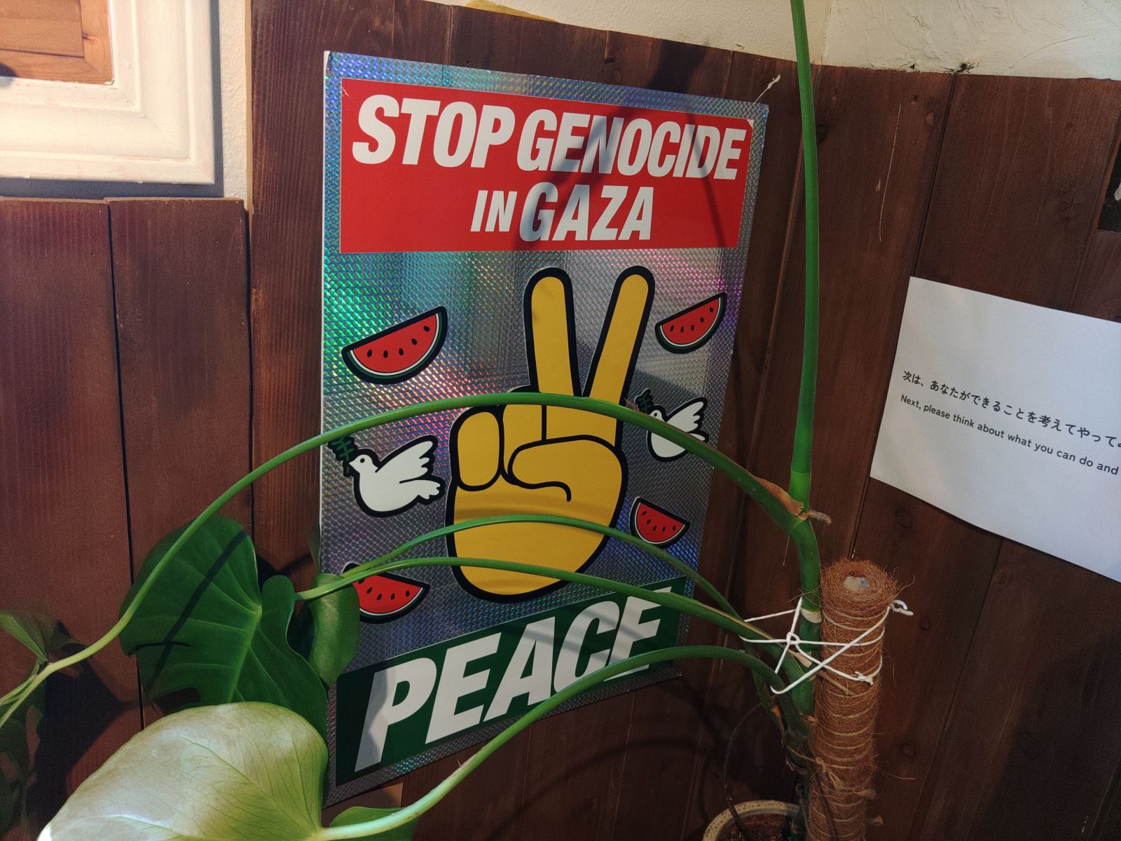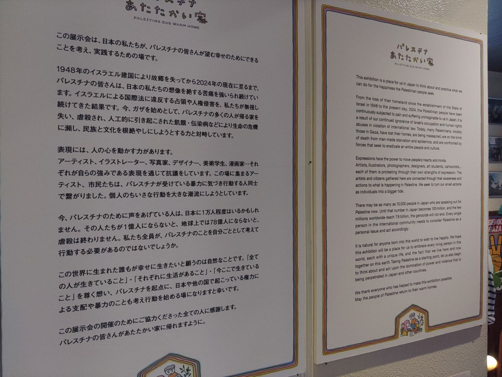 登戸駅近くのNAMNAM Spaceというところで開催されている『パレスチナ あたたかい家』と題された展覧会に行ってみました。一部屋のスペースに新進の作家のパレスチナ支援のためのいろんな絵や作品が並んでいます。このような展覧会を見に来るのは、ぼくのような、かわりもの、はぐれものの老人ばかりで、閑散としていると思いきや、それなりの人の入りで、ぼく以外は若い人ばかりであるのを、ぼくは希望と感じたのです。きっと、みんなの思いは一つ、虐殺がやむことを願うばかり。