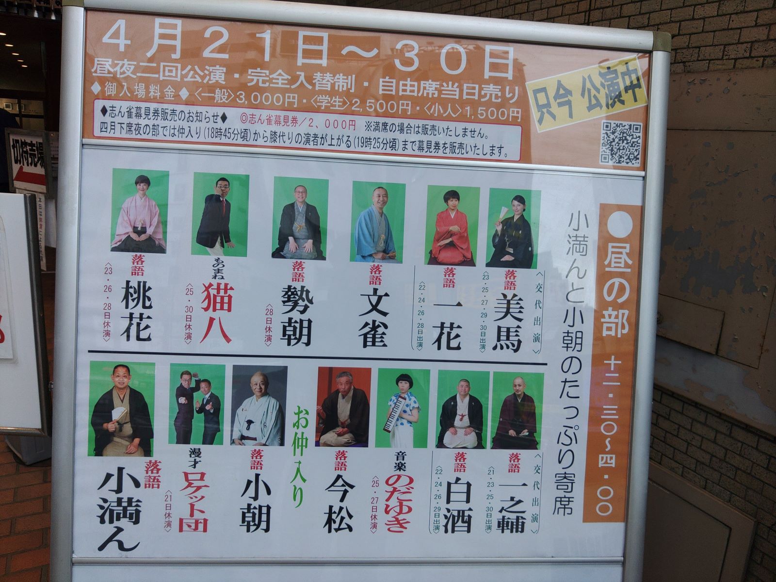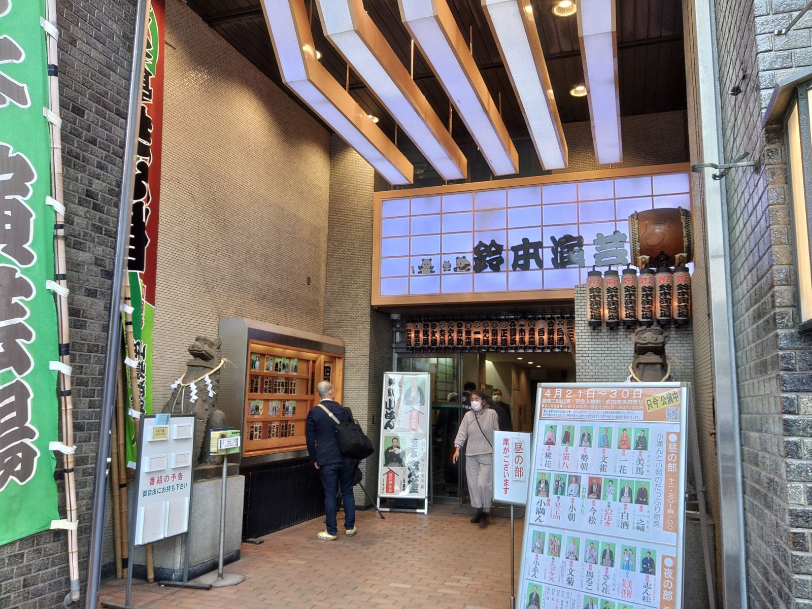 新宿の末廣亭の令和六年四月下席昼の部に行きました。見た演目を書き出してみます。二つ目の春風亭㐂いちくんの「牛ほめ」、柳家花いち師匠の「結婚記念日」、ホンキートンクの漫才、古今亭駒子師匠の「阿武松緑之助」、春風亭三朝師匠の「たらちね」、林家ペーさんの漫談、古今亭菊之丞師匠の「町内の若い衆」、桂扇生師匠の「宗論」、柳家小菊師匠の粋曲、吉原朝馬師匠の「源平盛衰記」、柳家小里ん師匠の「へっつい幽霊」でお中入りとなりました。春風亭一花師匠「権助提灯」、笑組の漫才、春風亭正朝師匠の「蜘蛛駕籠」、金原亭馬の助師匠の「権兵衛狸」、鏡味仙志郎師匠と仙成師匠の曲芸、主任は春風亭一之輔師匠で「天狗裁き」。