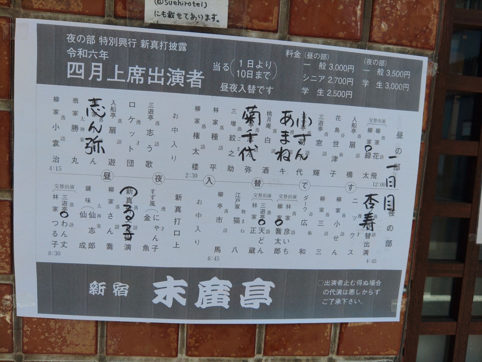 新宿末廣亭四月上席昼の部に行ってまいりました。見た演目を書き出してみます。前座の桃月庵ぼんぼりくんの「手紙無筆」、二つ目柳家緑太くんの「たらちね」、三遊亭窓輝師匠の「もぐら泥」、柳家小さん師匠の「長屋の花見」、立花家あまねさんの民謡、桃月庵白酒師匠の「子ほめ」、古今亭菊千代師匠の「権助魚」、三増紋之助さんの曲ごま、林家種平師匠の「ぼやき酒屋」、柳家権太楼師匠の「つる」で中入りとなりました。三遊亭志う歌師匠の「荒大名の茶の湯」、ロケット団の漫才、入船亭扇遊師匠の「狸さい」、古今亭志ん彌師匠の「無精床」、翁家勝丸さんの太神楽、主任は柳家小袁治師匠の「ねずみ」でした。