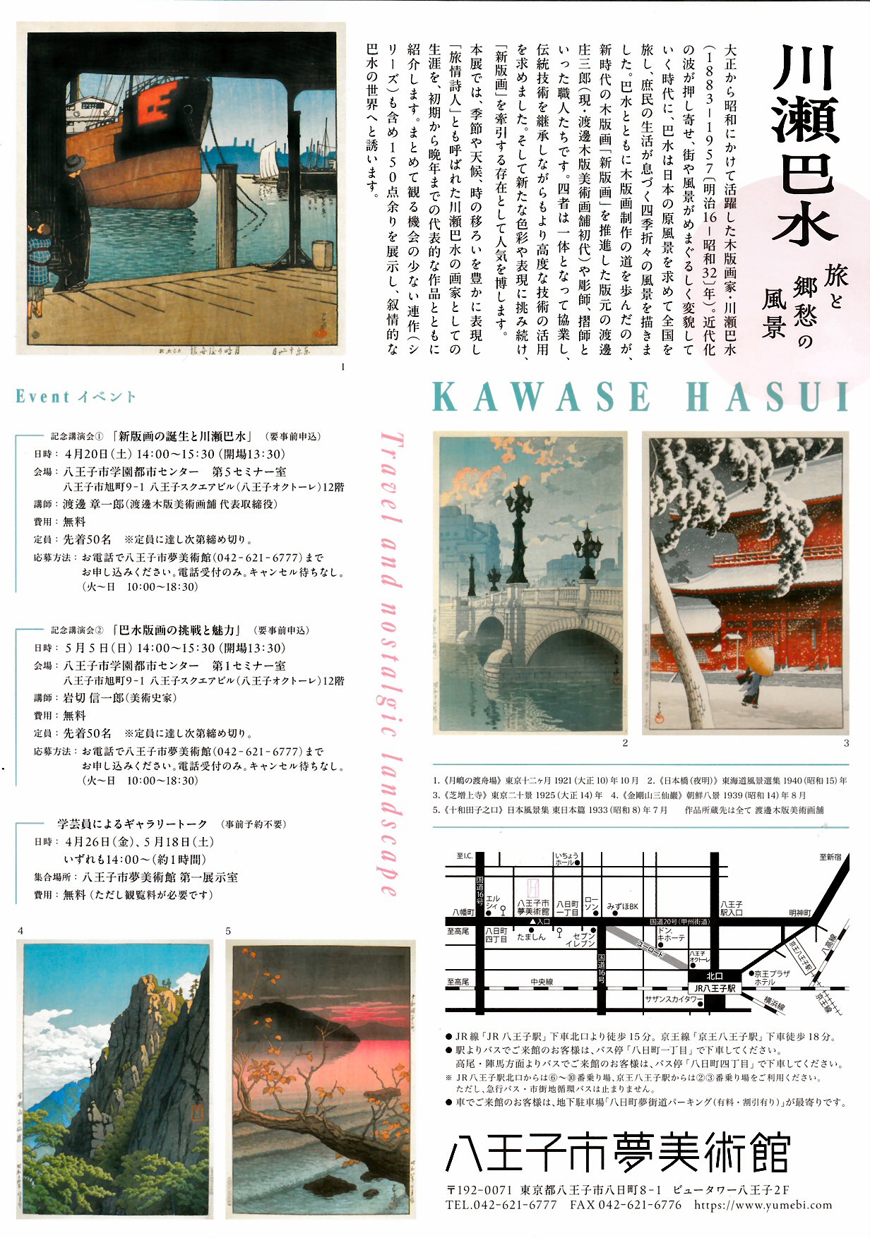 八王子市夢美術館で『川瀬巴水 旅と郷愁の風景』を見ました。川瀬巴水のいわゆる新版画を鑑賞していると、なんともいえないような懐かしさを感じて、なんだか泣きたいような気持ちになります。柄谷行人さんは、その著書『日本近代文学の起源』で近代になり初めて日本人は「風景」を発見したというけれど、ぼくの川瀬巴水の版画を見ての感情の高ぶりも、その近代人の「風景」の発見によるのだろううか、などと考えます。むしろ、川瀬巴水の「風景」とは一瞬にして風のように過ぎ去る景色なのではないかしら? 川瀬巴水は旅の名所よりもありきたりな景色を好んだといいます。その余情はすぐれた俳句のようでもあって、あー、それこそが「風景」なんだと、せんかたないことを考えてしまいつつ、なんでもない夕暮れの風景の薄明かるい窓や寂しげな人影に、なんだか、ぼくは泣きたくもなるのです。