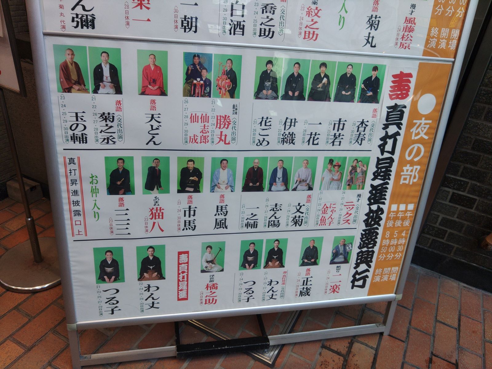 さて、披露された演目を書き出してみます。二つ目の柳亭市若くんの「出来心」、翁家勝丸さんの大神楽曲芸、三遊亭天どん師匠の「初天神」、五明樓玉の輔師匠の「宗論」、すず風にゃん子さんと金魚さんの漫才、古今亭志ん陽師匠の「代書屋」、鈴々舎馬風師匠の漫談、柳亭市馬師匠の「高砂や」、江戸家猫八さんのものまね、柳家三三師匠の「狸さい」で中入りとなりました。その後、林家つる子さんの真打昇進披露口上がありまして、林家楽一さんの紙切り、林家正蔵師匠の「松山鏡」、三遊亭わん丈師匠の「県民性」、立花家橘之助さんの浮世節、今夜の主任の林家つる子師匠の「中村仲蔵」。