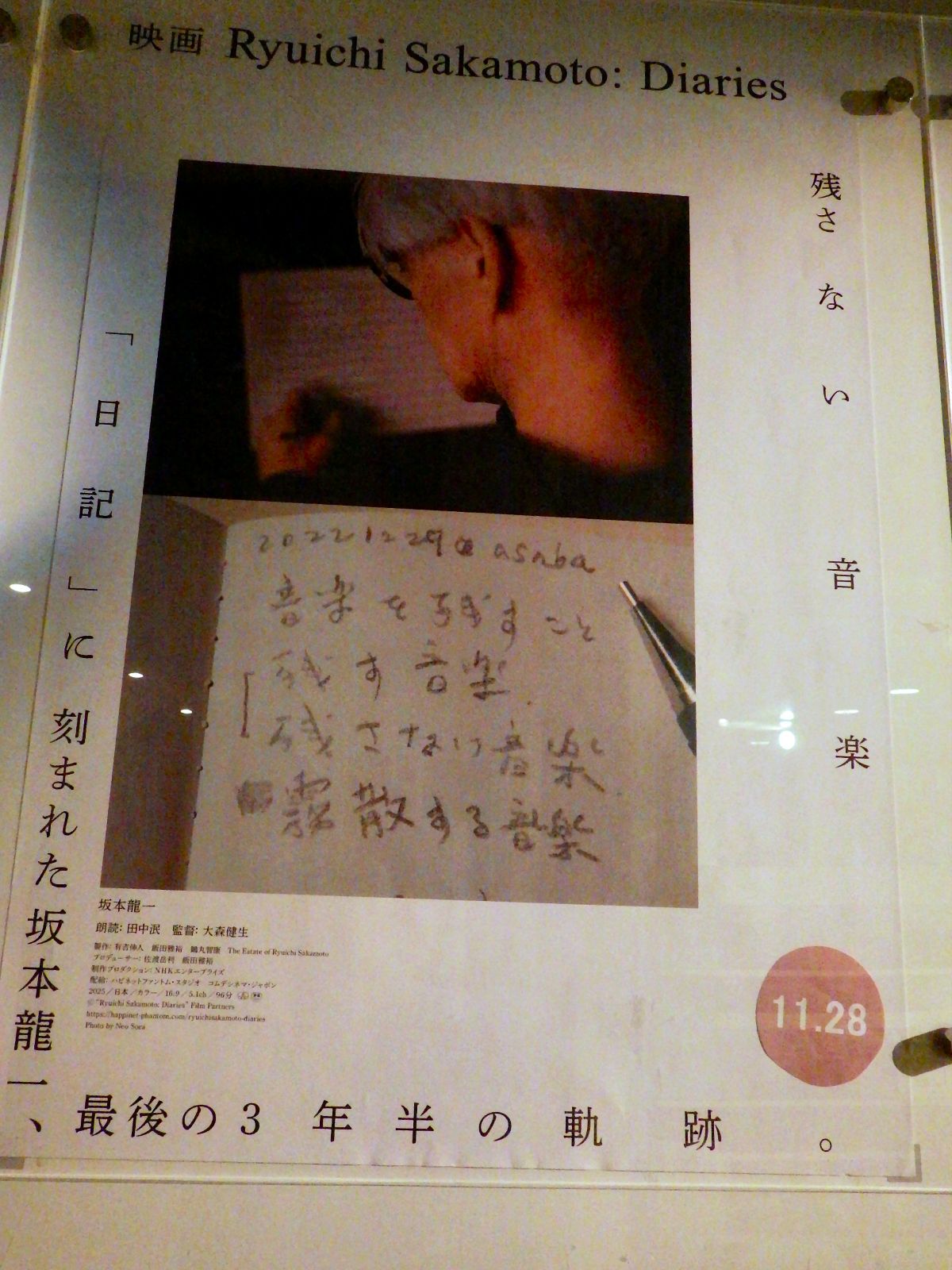 アップリンク吉祥寺で大森健正監督の『Ryuichi Sakamoto: Diaries』を見ました。坂本龍一さんの最期の三年間を追ったドキュメンタリー。重たい内容でしたが、感動しました。ラストの気力を振り絞っての坂本龍一さんのスマホに映る、その中の東北ユースオーケストラへの病床での「そうだ、それでいいんだ」の声援を送る姿に胸にこみあげるものがあり、ぼくは嗚咽すらしたのであります。若い人たちの奏でる音楽は美しく、その音楽ように世界は美しく、坂本さんは死によってその美しい世界にはとどまれない、そのような坂本さんは若い人たちに確かな美しく正しいものを手渡そうとしているかのようなのです。