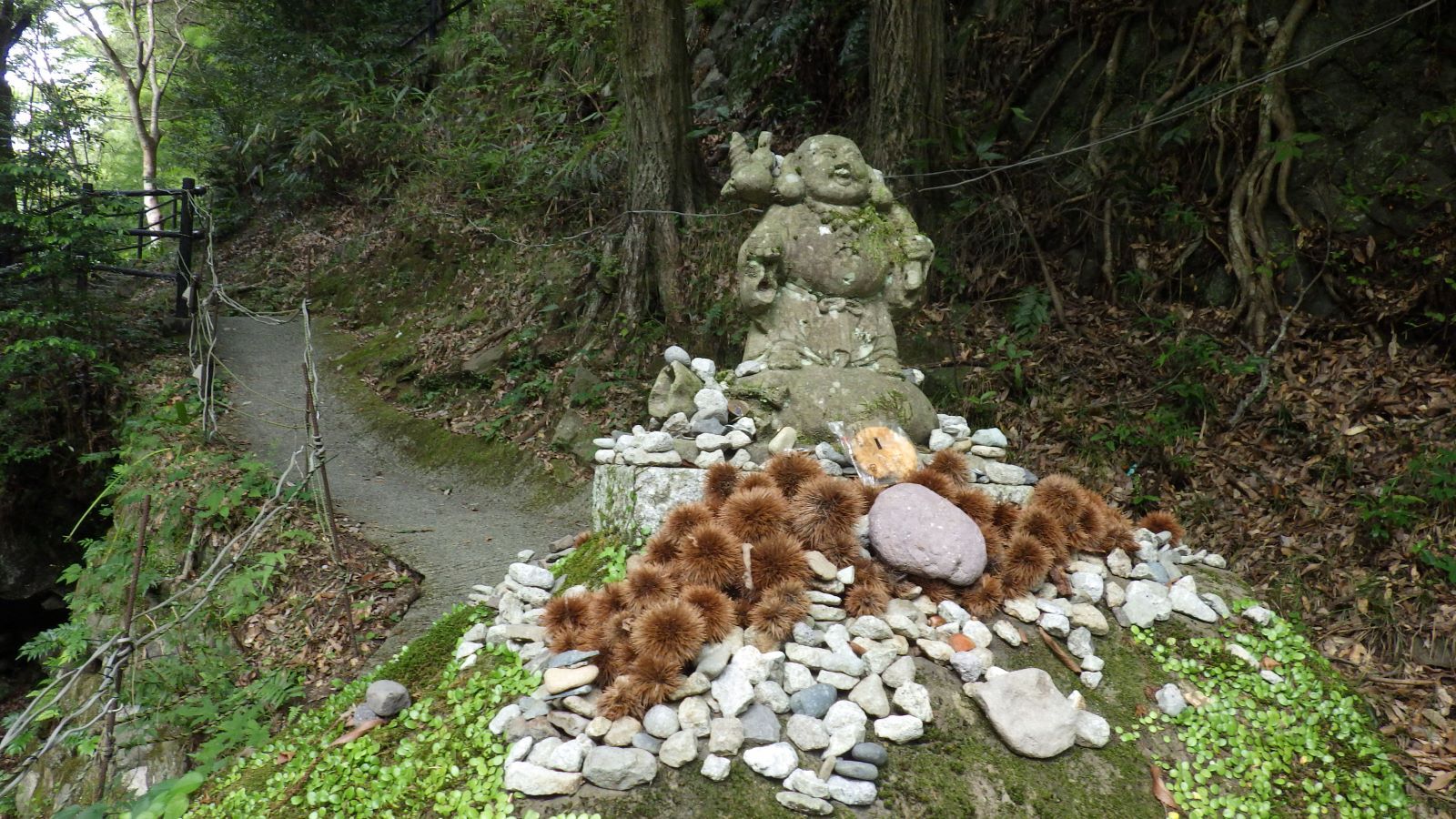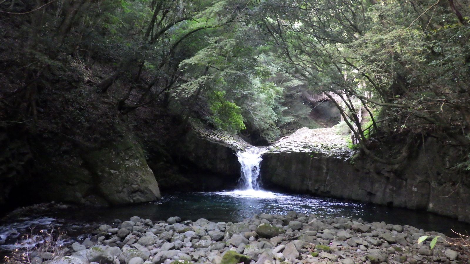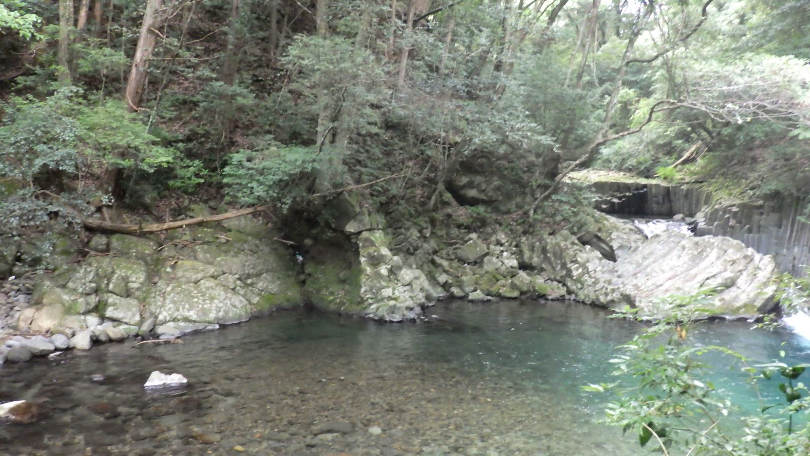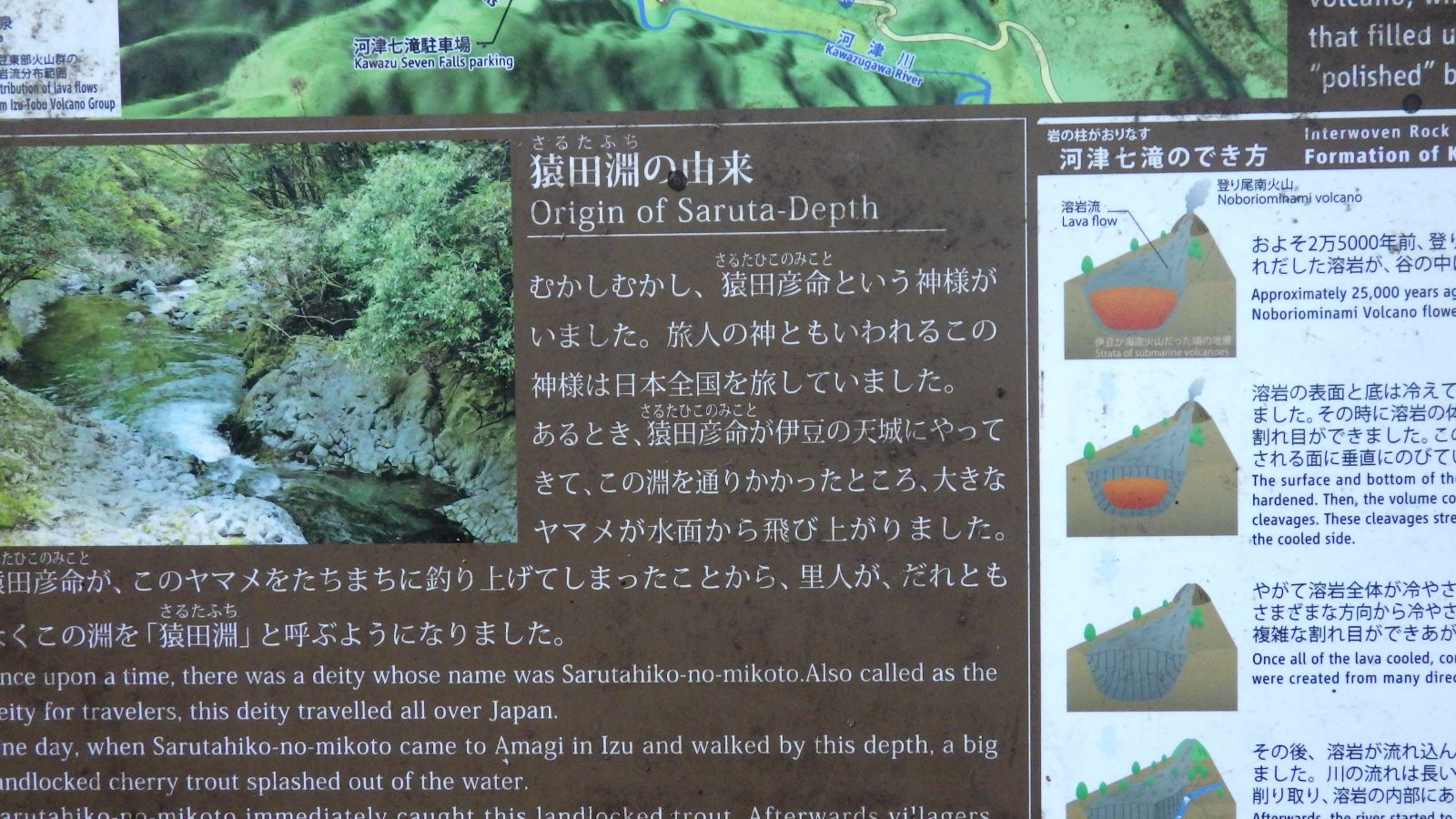 天城山を越えたところにある七滝(「七滝」と書いて「ななだる」と読みます)と猿田淵で毛鉤の釣りをしようとしましたが、ボーズ(一匹も釣れないこと)でした。七滝と猿田淵の中で容易に入渓できるのは、カエル滝と初景瀧のみで、ウェイダー(胴長)をきていなかったので、厳しかった。しかし、ウェイダーを着けていても滝があるので下るしかなさそうです。そこで一句、読みました。看板で猿田彦命(さるたひこのみこと)の猿田淵の云われを知ったのです。