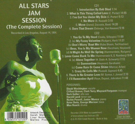 ライブ・レコディング紹介の第七弾はこの"ALL STARS JAM SESSION (The Complete Session)"にしましょう。今日、中古CD屋さんで見つけ思わず買ってしまって聴いています。あの"Dinah Jams"の完全版なのだ。時は1954年8月14日、Clifford Brownらの若きアメリカ西海岸のジャズのつわものが、ブルースの女王Dinah Washingtonを招きいれ、とあるスタジオでお客さんを前に夢のようなセッションを繰り広げたのです。その夢の一部始終が聴けるのですぞ。